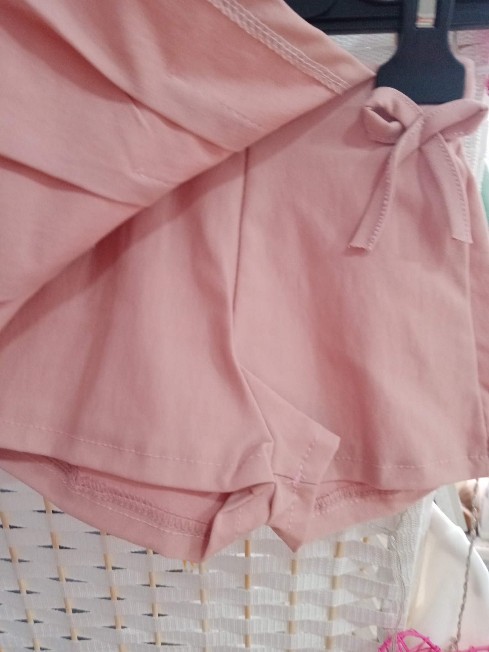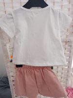 Conjunto de t-shirt de manga curta com um estampado, saia calção com um laçinho tem pregas à frente e tráz e cintura elástica.